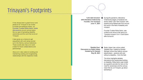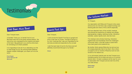 Trinayani is an NGO that works towards spreading awareness about disability and advocating for an inclusive future. The practice of creating an Annual Report, to be shared with the public, was relatively new at Trinayani, thus I had a lot of creative freedom to experiment with the visual style. I took this as an opportunity to work with areas that I most struggled with, namely colour and illustration.